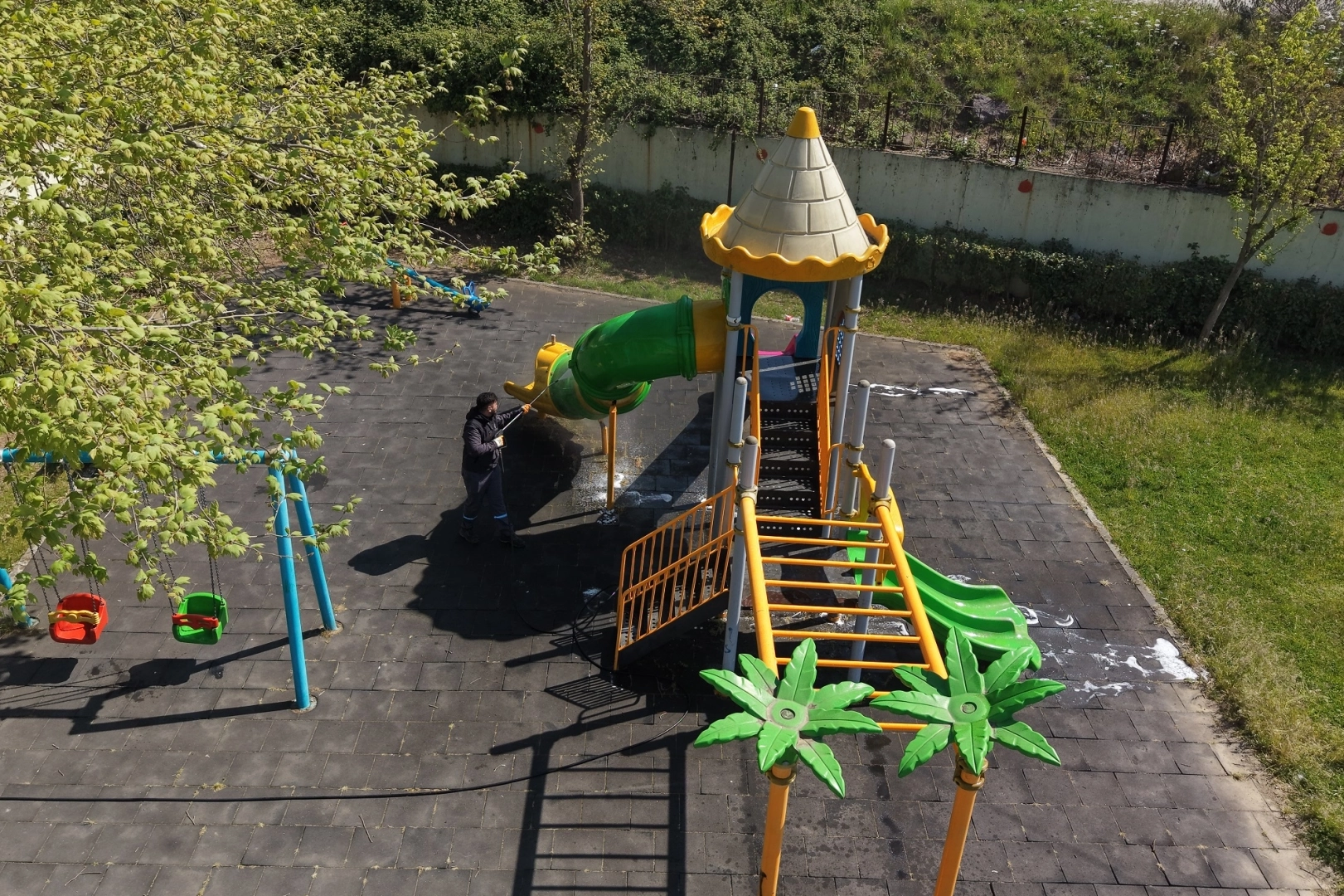 Parklarda düzenli olarak yapılan temizlik çalışmalarına ek olarak, Çayırova Belediyesi Park ve Bahçeler Müdürlüğü ekipleri ile Çayırova Belediyesi Temizlik İşleri Müdürlüğü ekipleri, ilçedeki parkların oyun gruplarını dip bucak temizliyor. Temizlik araçlarıyla birlikte parklara giden ekipler, yaz aylarında çocuklar tarafından yoğun olarak kullanılacak oyun gruplarını tertemiz yapıyor ve bu sayede Çayırovalı minikler için sosyal donatı alanlarını daha uygun hale getiriyor.