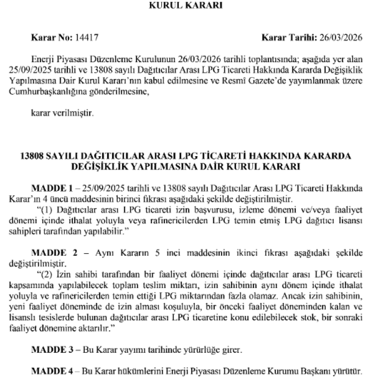 ANKARA (İGFA) - Enerji Piyasası Düzenleme Kurumu (EPDK), 26 Mart 2026 tarihli ve 14417 sayılı kurul kararıyla dağıtıcılar arası LPG ticaretine yönelik önemli değişikliklere imza attı.