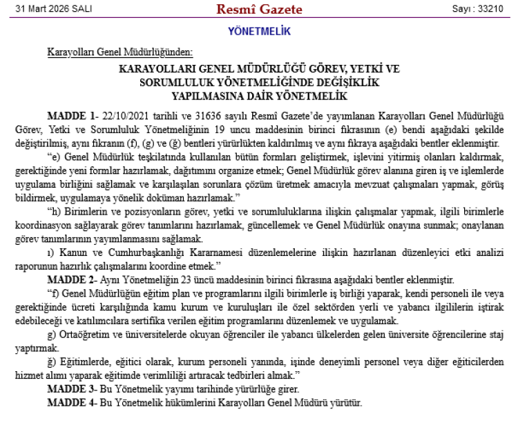 Karayolları Genel Müdürlüğü’nün görev, yetki ve sorumluluklarına ilişkin yönetmelikte değişikliğe gidildi. Yeni düzenleme ile görev tanımları, eğitim faaliyetleri ve mevzuat çalışmaları yeniden şekillendirildi.